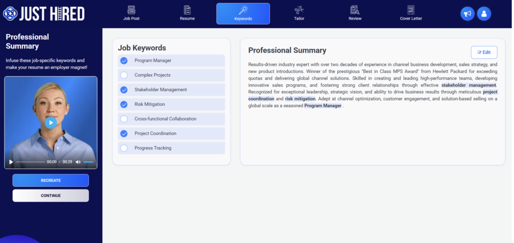 Customizing your professional summary doesn’t have to be time-consuming or stressful. Just Hired’s best in class AI takes the guesswork out of the process: